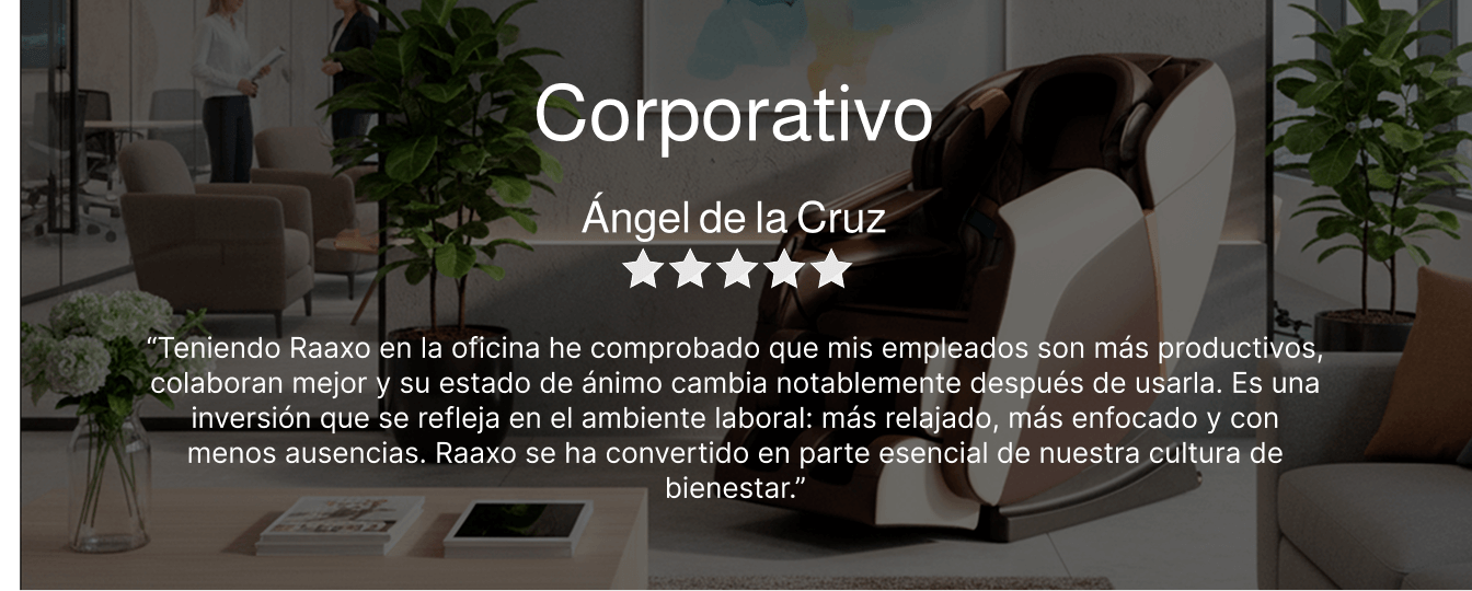 “Teniendo Raaxo en la oficina he comprobado que mis empleados son más productivos, colaboran mejor y su estado de ánimo cambia notablemente después de usarla. Es una inversión que se refleja en el ambiente laboral: más relajado, más enfocado y con menos ausencias. Raaxo se ha convertido en parte esencial de nuestra cultura de bienestar.”
