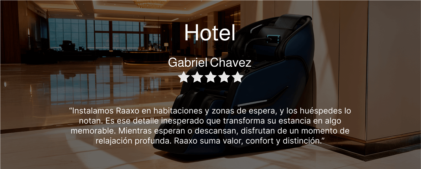 “Instalamos Raaxo en habitaciones y zonas de espera, y los huéspedes lo notan. Es ese detalle inesperado que transforma su estancia en algo memorable. Mientras esperan o descansan, disfrutan de un momento de relajación profunda. Raaxo suma valor, confort y distinción.”